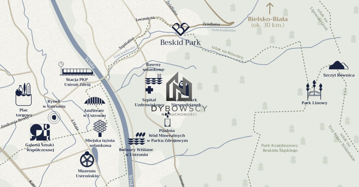Inwestycja powstaje na granicy lasu i miasta, w sercu Park Krajobrazowy Beskidu Śląskiego, w sąsiedztwie szlaków prowadzących na Czantoria Wielka, Równicę, Trzy Kopce Wiślańskie czy Lipowski Groń. Wyjście z apartamentu prosto na trasę spacerową, biegową lub MTB. Zimą to idealna baza dla narciarzy i skitourowców, latem - dla miłośników rowerów, graveli i górskich wędrówek. W kilka minut spacerem można dotrzeć do centrum uzdrowiska z Parkiem Zdrojowym, restauracjami, kawiarniami i bogatą ofertą SPA.