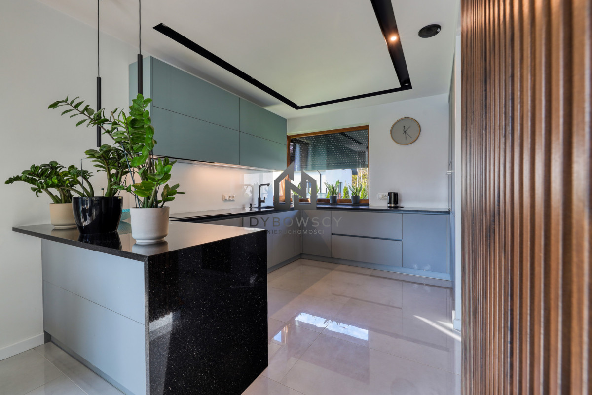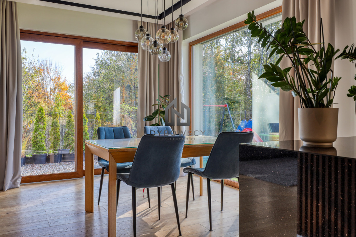 - elegancka kuchnia z kamiennym blatem oraz częścią jadalnianą otoczoną dużymi oknami,