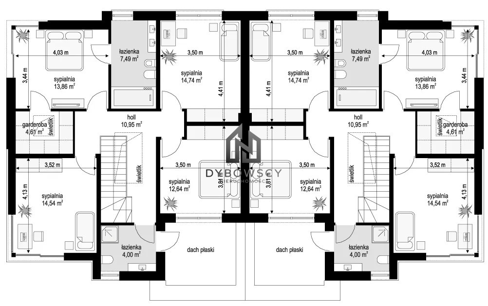 - 4 sypialnie (14,74m², 12,64m², 14,54m², 13,86m²)