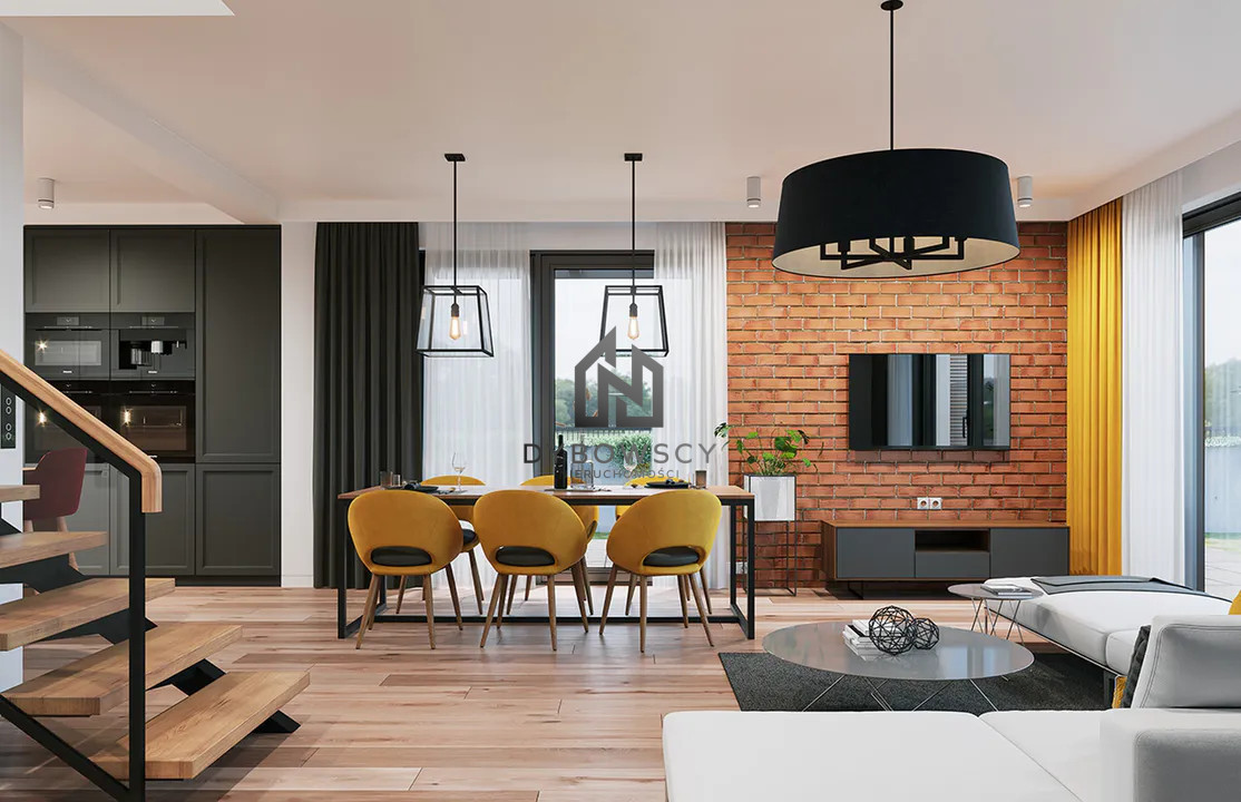 Strefa dzienna została zaprojektowana jako otwarta przestrzeń z dużymi przeszkleniami oraz bezpośrednim wyjściem na ogród.